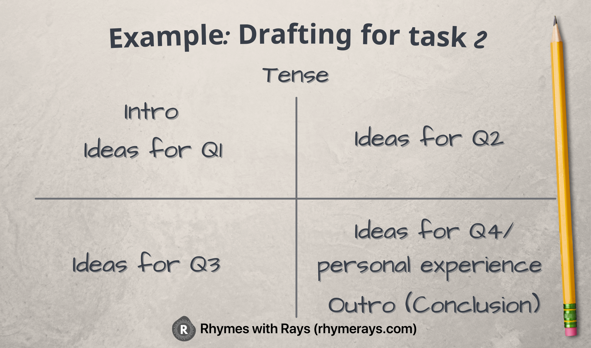 The key to task 2 is to get your ideas prepared soon as possible, then present them properly in time. I recommend the 4 squares tactic for drafting your answer (see the figure below).